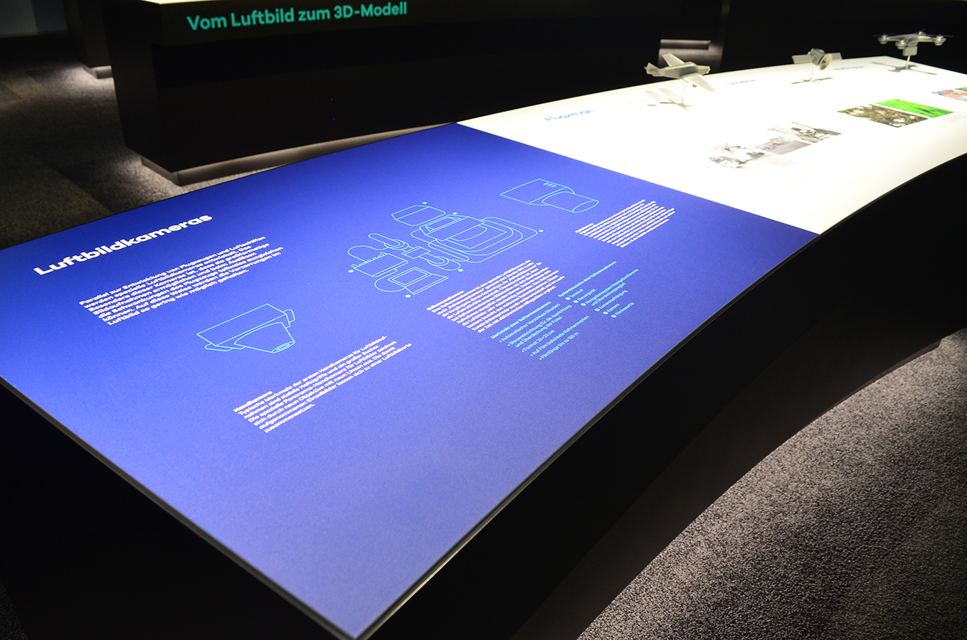An der Recherchestation können Luftbilder aus ganz Bayern aufgerufen werden. Dabei werden Veränderungen von Landschaften und Städten gut sichtbar. Ein virtueller Flug über die Zugspitze, der Blick durch eine Anaglyphenbrille oder durch ein Stereoskop machen deutlich, wie Gebäude und Landschaften in Luftbildern zu dreidimensionalen Objekten werden.